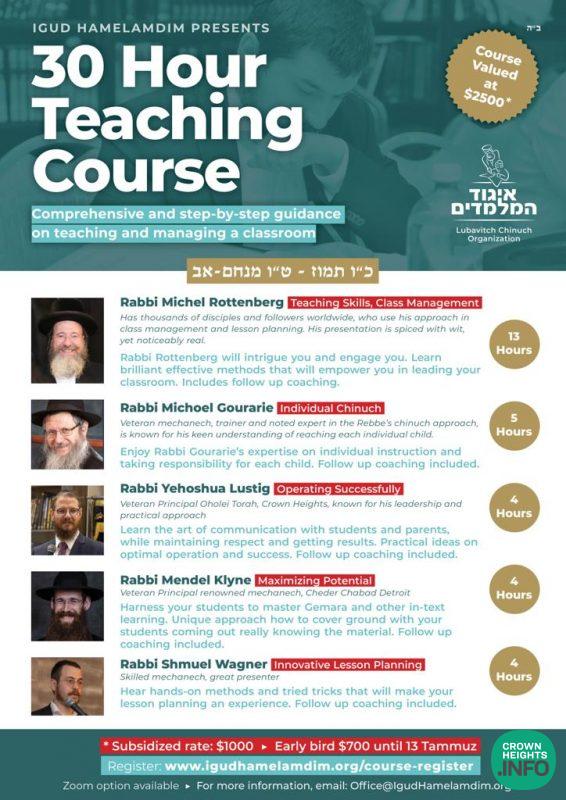 As previously reported on Crownheights.info, Igud Hamelamdim will be running its 8th gold-star Teachers’ Training Course, in-person and online.