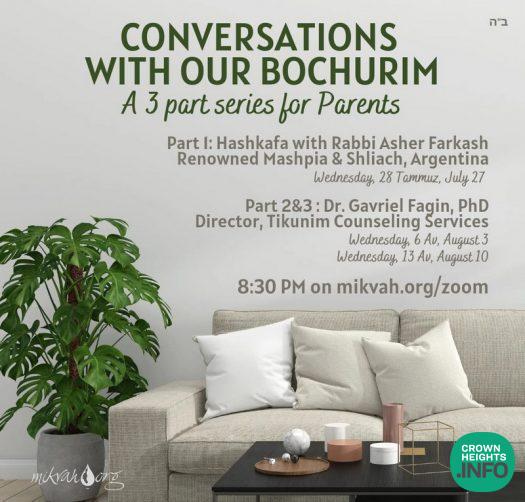 The final session of our three part series titled Conversations with our Bochurim will be Wednesday, August 10, 13 Av with Dr. Gavriel Fagin PhD, Director Tikunim Counseling Services. We are certain that you will receive the proper guidance and support on how, and at what age to have conversations on sensitive topics with your teenage boys and beyond, and with Hashems help this will ensure healthy development as they grow into adulthood.