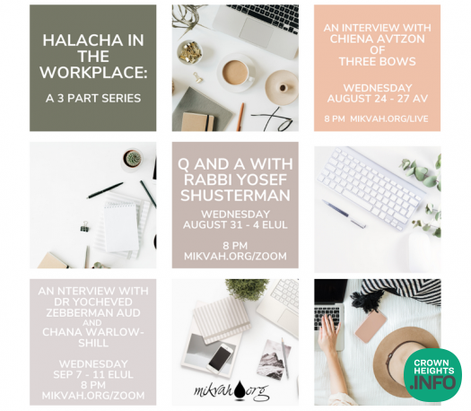Part three will be the following Wednesday 11 Elul, September 7, 8:00 PM. We will be interviewing an additional two professional women, Mrs. Yocheved Zebberman AuD, and Chana Warlow Shill, principal and founder of Warlows Legal, who will discuss their perspective on keeping boundaries and how they incorporate all the Halachik issues that Rabbi Shusterman addressed. mikvah.org/zoom