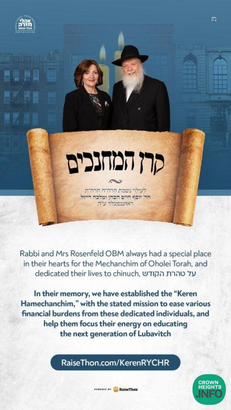 Today, with the blessing and consent of the Rosenfeld family, “Keren Hamechanchim” was formed in loving memory of Rabbi and Mrs. Rosenfeld, who dedicated their lives to the chinuch of our children.