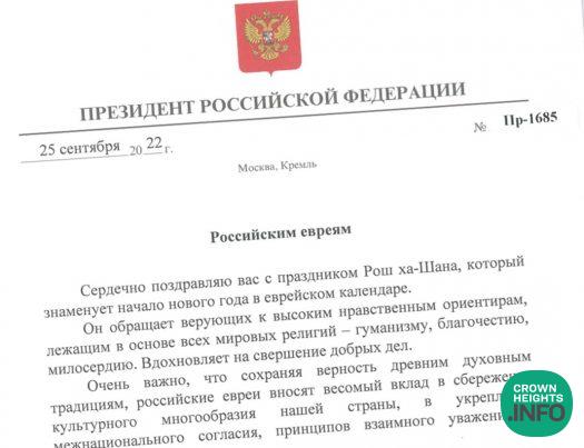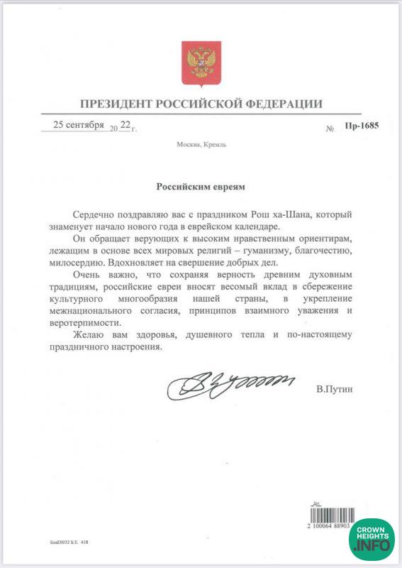 At the office of the Chief Rabbi of Russia, Rabbi Berel Lazar Shalita, a greeting card arrived from the President of Russia, Vladimir Putin, wishing the Jews of the country blessings for Rosh Hashanah and the New Year.