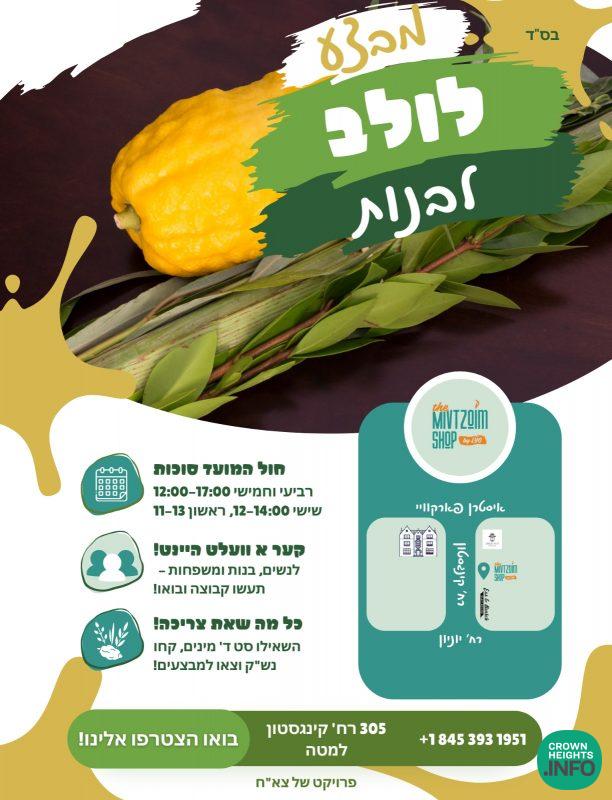 Conveniently located near the train station, the center will be set up at 305 Kingston Ave (in the Levi Yitzchok Library) and will be open on Chol Hamoed – Wednesday 12:00 – 5:00 PM, Thursday 12:00 – 5:00 PM, Friday 12:00 – 2:00 PM, and Sunday 11:00 AM – 1:00 PM. Looking forward to greeting you when you stop by!