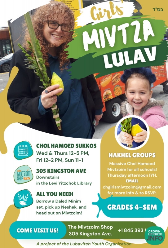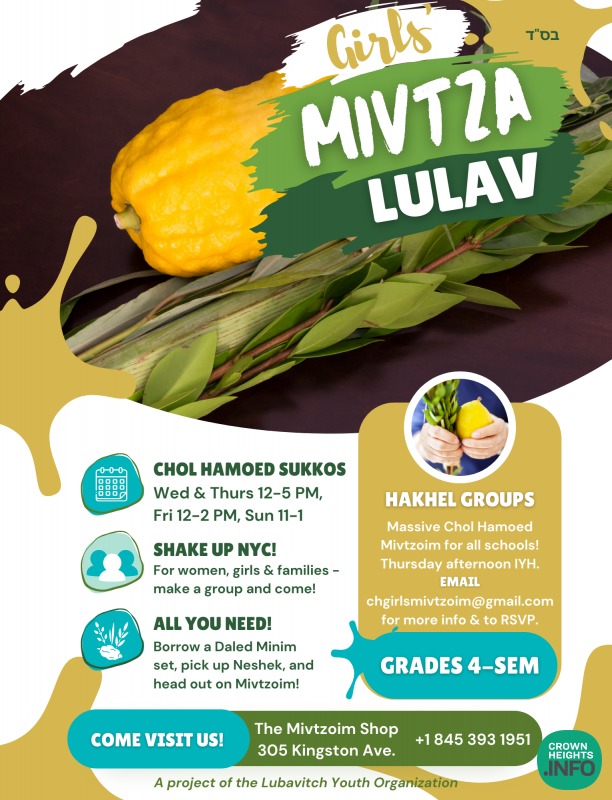 Crown Heights girls: In honor of Hakhel, this year we are having a Massive Chol Hamoed Mivtzoim on Thursday, for girls from all schools! Email chgirlsmivtzoim@gmail.com for more info & to RSVP.