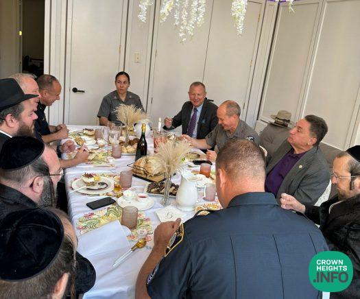 Monroe businessman and activist Joseph Greenfeld hosted a special brunch for law enforcement agencies in his Sukkah. Mr. Greenfeld is the owner of AllsTiles, a local business. Leaders and officers of local and state law enforcement agencies, including Monroe, Goshen and Liberty, attended the elegant brunch.