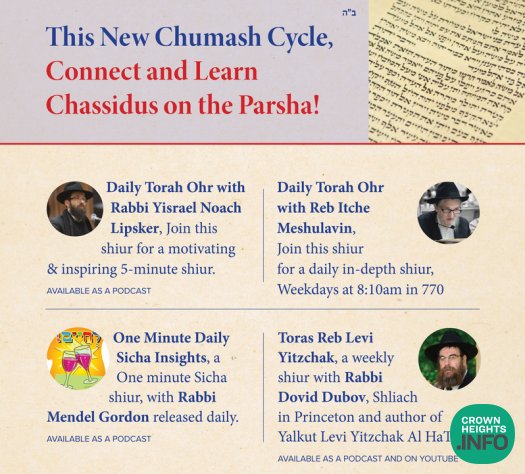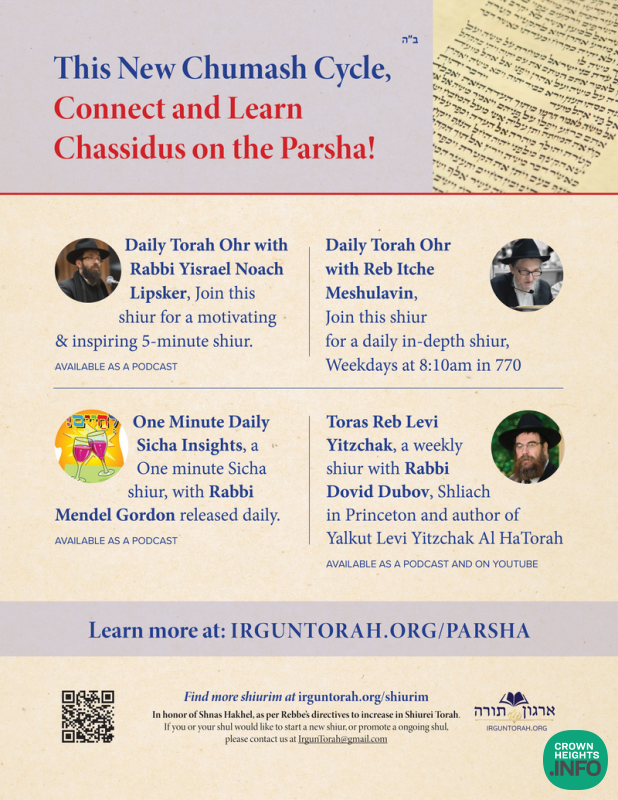 For the new Chumash Cycle, Connect and learn with the Parsha the Chassidishe Way! Irgun Torah presents these insightful shiurim for you to connect daily with the Chassidishe Parsha!