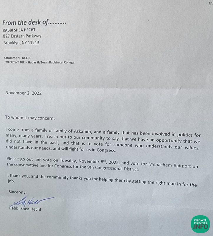 “I reach out to our community to say that we have an opportunity that we did not have in the past, and that is to vote for someone who understands our values, understands our needs, and will fight for us in congress,” Rabbi Shea Hecht wrote. “Please go out and vote on November 8th, 2022, and vote for Menachem Raitport on the conservative line for Congress for the 9th congressional District.”
