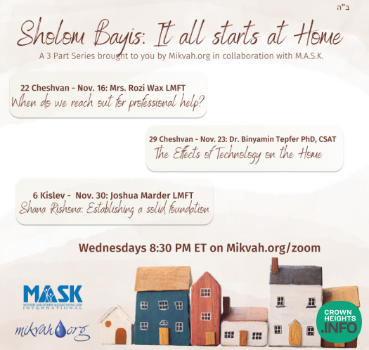 Mikvah.org in collaboration with MASK is happy to announce their upcoming three part series on Shalom Bayis: “It All Starts At Home”. A wonderful lineup of presenters will be covering three main topics.