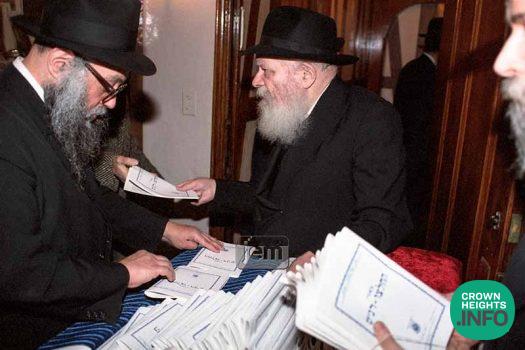 The Rebbe distributes a printed booklet of Kuntres Hechaltzu of the Rebbe Rashab.