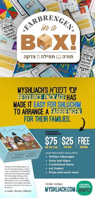 Look out for Farbrengen-In-A-Box in local Crown Heights Judaica shops or you can order online by clicking here.