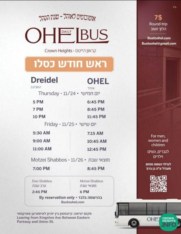 In honor of the Rosh Chodesh Kislev taking place this week, the Ohel Bus Service will be providing extra subsidized transportation round trip from Crown Heights to the Ohel beginning on Thursday, Nov. 24th through Motzei Shabbos, Nov. 26th.