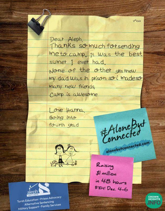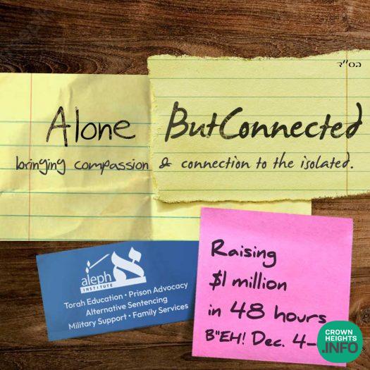 The Aleph Institute has launched its #AloneButConnected campaign to B”EH raise $1M to support people who are isolated from the broader community: individuals incarcerated in prisons, members of the U.S. Armed Forces, and their loved ones left behind.