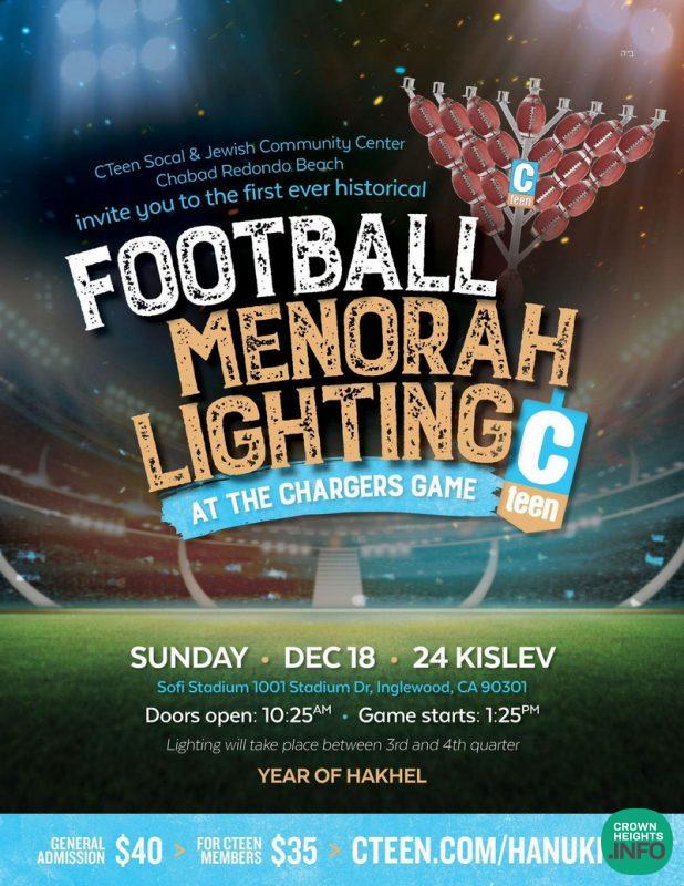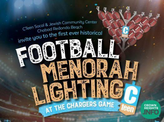 In a historic moment, a grand menorah lighting will take place in the middle of an NFL football game on the first night of Chanukah this year. More than 75,000 fans are expected to watch the menorah lighting between the 3rd and 4th quarter of the LA Chargers Vs. Tennessee Titans game on Sunday, December 18th. The menorah lighting is a project of CTeen International and Chabad of Redondo Beach.