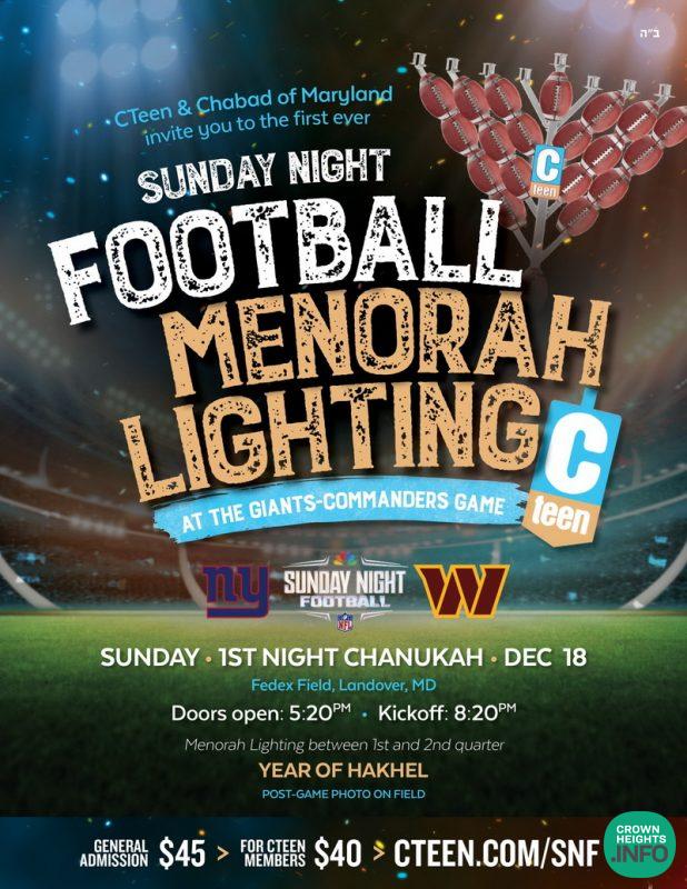 There will be sixty-two thousand east-coast fans present at FedEx Field, when the Menorah is lit. “It’s a truly unprecedented opportunity to share the warmth and light of Chanukah,” says Rabbi Mendy Kotlarsky of CTeen International.