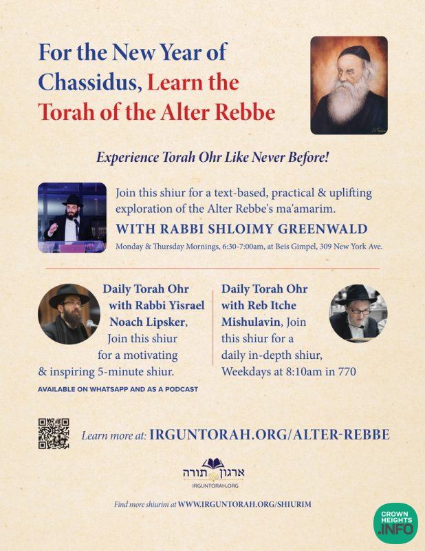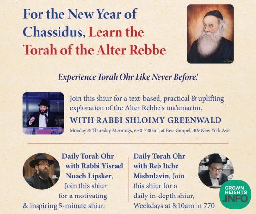 - Join a twice-weekly text-based, practical and uplifting exploration of the Alter Rebbe’s ma’amarim, with Rabbi Shloimy Greenwald, Monday and Thursday Mornings, 6:30-7:00am at Beis Gimpel, 309 New York Ave. Mezonos and coffee are served.