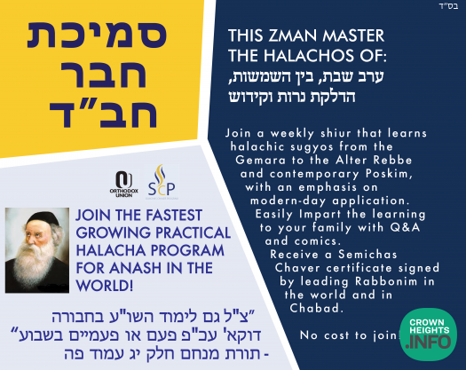 Join a weekly shiur that learns halachic sugyos from the Gemara to the Alter Rebbe and contemporary Poskim, with an emphasis on modern-day application. Easily Impart the learning to your family with Q&A and weekly handouts of shiur.