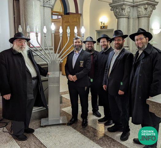 In honor of Shnas Hakhel, Rabbi Avtzon approached the city with the idea of having a Menorah displayed for all eight days in city hall, and to have a much larger Menorah lighting. After receiving permission from the Mayor’s office, Jewish Councilman, Mr. Mark Jeffreys reached out to the local Federation who readily agreed to participate and to sponsor the Menorah. The leaders of the federation, and many other Jewish organizations, joined the local Shluchim in a true show of unity. They spoke about the importance of the display of a Menorah on the official property of the city, echoing the Rebbe’s call from years ago. The event was covered by all the local news channels and newspapers.