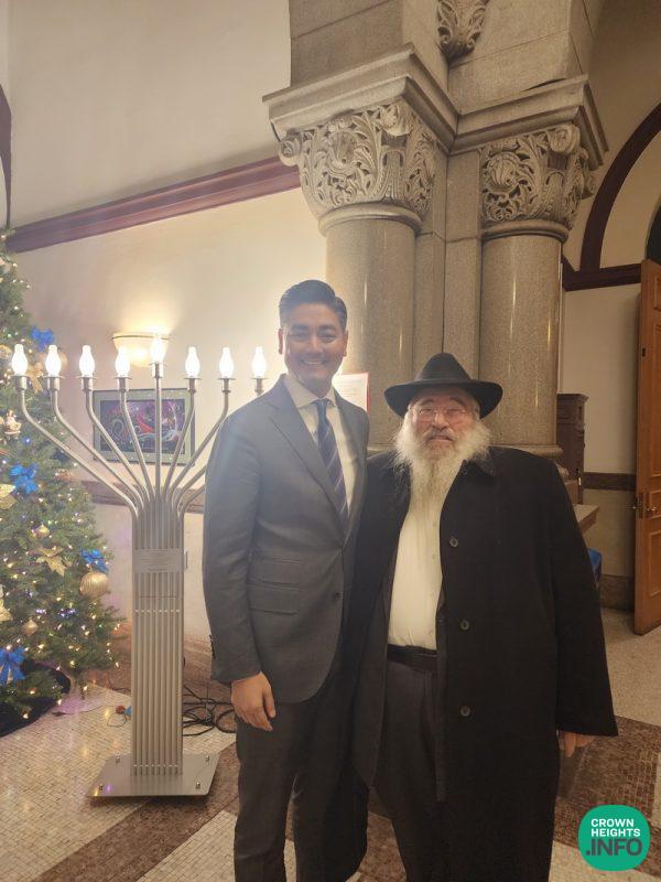 Rabbi Gershon Avtzon, honored the Mayor with lighting the “Public Servant Candle” (shamash) and the Jewish councilman lit the actual candle of the Menorah. The event concluded with everyone enjoying Kosher Chanuka treats and learning about Hakhel and many Menorahs were distributed.