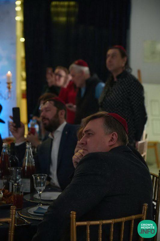 On a huge screen, the guests saw and heard the Lubavitcher Rebbe speak about the great privilege and responsibility we each have in spreading the light of Yiddishkeit.