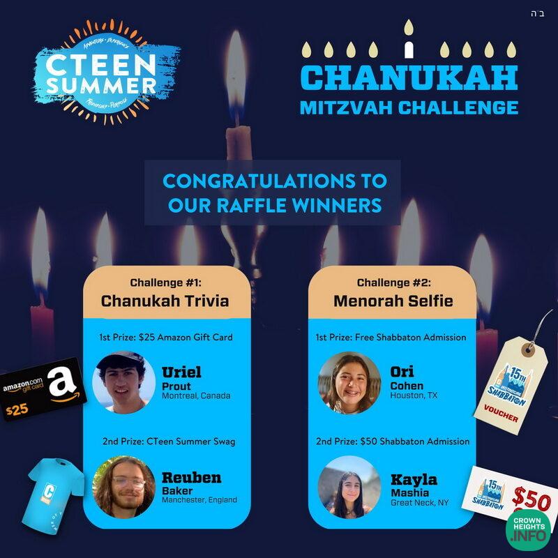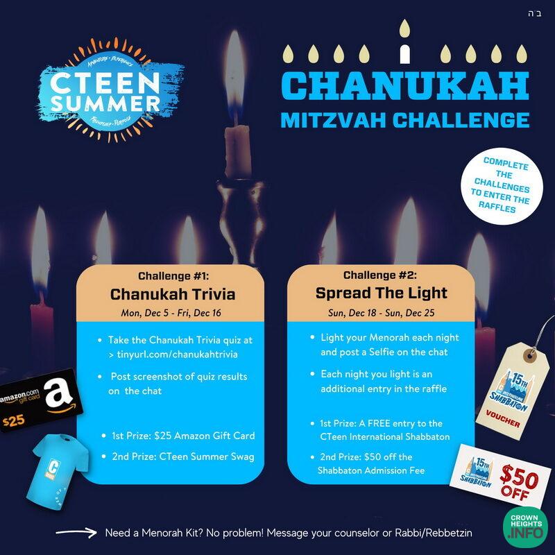 This month’s challenge gave CTeen Summer alumni the opportunity to learn about Chanukah through an interactive online quiz and connect with other teens by encouraging them to share menorah-lighting selfies on their ongoing camp WhatsApp groups. Both parts were a success. But this challenge came with an unexpected bonus: “The teens took this to another level and proudly displayed their menorah selfies across social media. The teenagers were excited to share their Judaism on their personal accounts, a space the average teen is pretty selective about,” shares Mendy Lepkivker, program coordinator, “in effect, they were lighting up the world.”