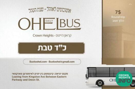 In honor of Chof Daled Teves, the Ohel Bus Service will be providing extra subsidized transportation round trip from Crown Heights to the Ohel on Monday, Jan. 16th and Tuesday, Jan. 17.