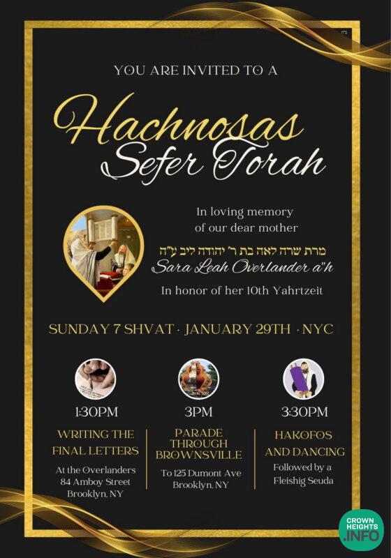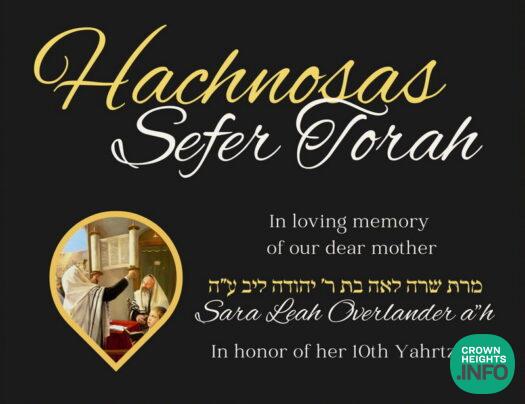 The Overlander Family invites the entire Anash community to a Siyum and Hachnasas Sefer Torah on Sunday, 7 Shevat, in memory of Rebbetzin Sara Leah Overlander A”H.