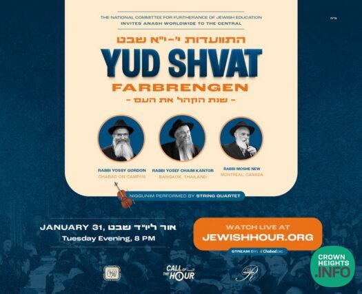 The National Committee for Furtherance of Jewish Education has announced the speakers for the upcoming live Farbrengen in honor of Yud Shvat, to be held this coming Tuesday evening, Or L’Yud Shvat, January 31 at 8pm EST.