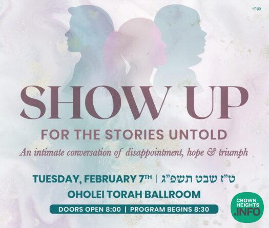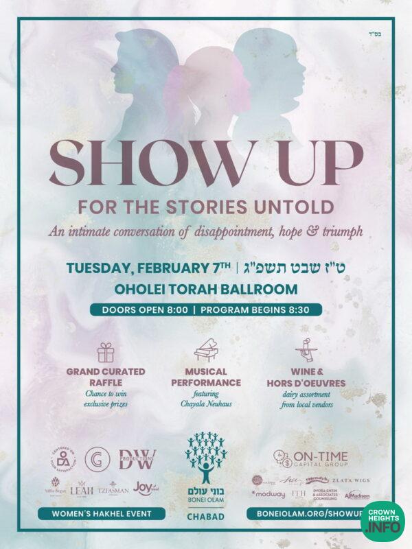 Since our initial Show Up event in 2020, the community has shown up in overflow of numbers, surpassing each previous year. This year, for the third time, we ask once again to come and show support. Show up for the stories untold; an evening of intimate conversation of disappointment, hope and triumph with a musical performance by Chayala Neuhaus.