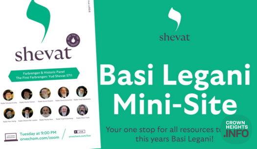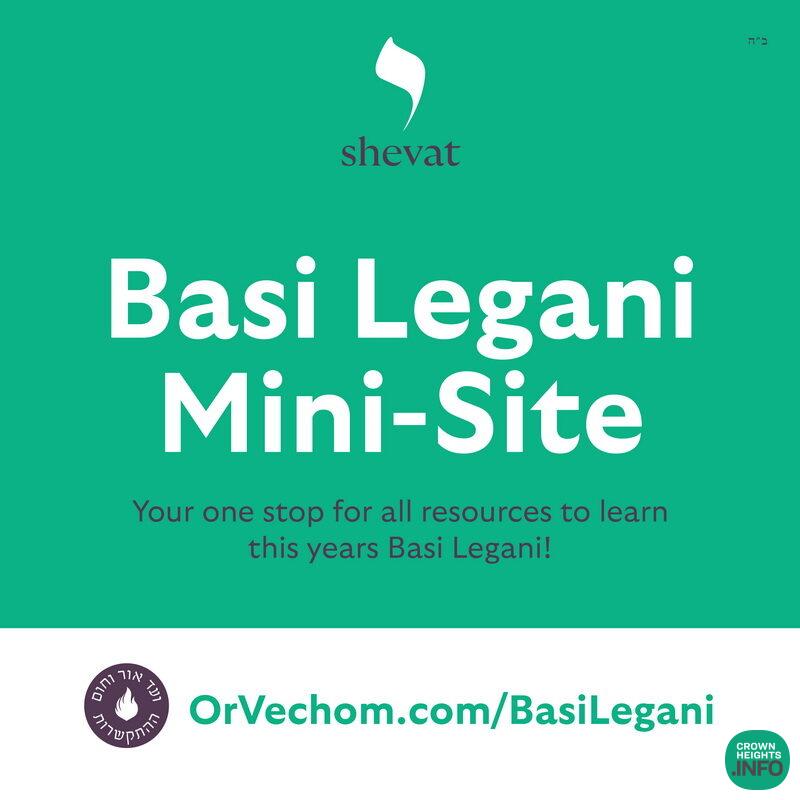 For a full Yud Shevat resource site, visit YudShevat.org. For resources to assist you in learning this year’s Basi Legani, visit OrVechom.com/BasiLegani
