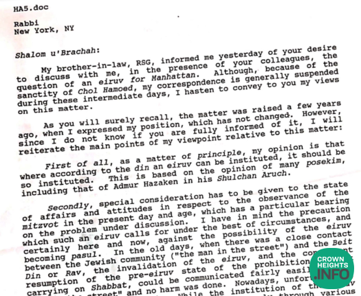 My brother-in-law, RSG [Rabbi Shmaryahu Gurary], informed me yesterday of your desire to discuss with me, in the presence of your colleagues, the question of an eiruv for Manhattan. Although, because of the sanctity of Chol Hamoed, my correspondence is generally suspended during these intermediate days, I hasten to convey to you my views on this matter.