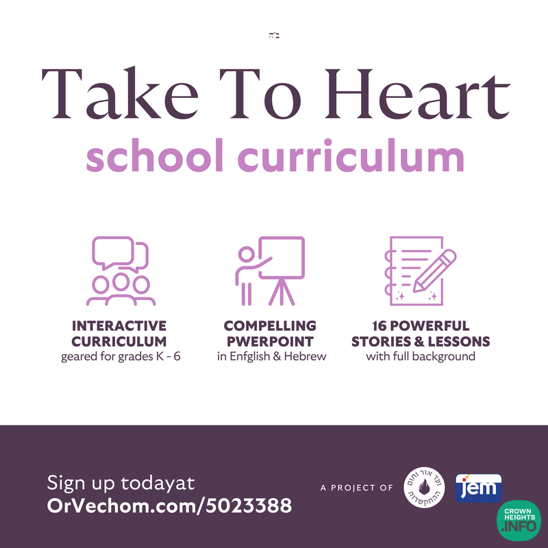 “Take to Heart” is an easy-to-use and adaptable school curriculum that gives teachers the tools to mark this day and learn from the Rebbetzin together with their students. The curriculum includes a PowerPoint presentation, videos, engaging activities, and a Teacher’s Guide to explain it all. It is designed for each teacher to customize it for their classroom by choosing which points and stories they want to give over to their students.