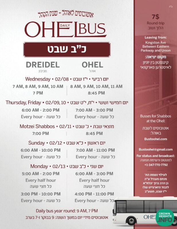 In honor of Chof Beis Shvat, the Ohel Bus Service will be providing extra subsidized transportation round trip from Crown Heights to the Ohel on Wednesday, Feb. 8th through Monday, Feb. 13th.