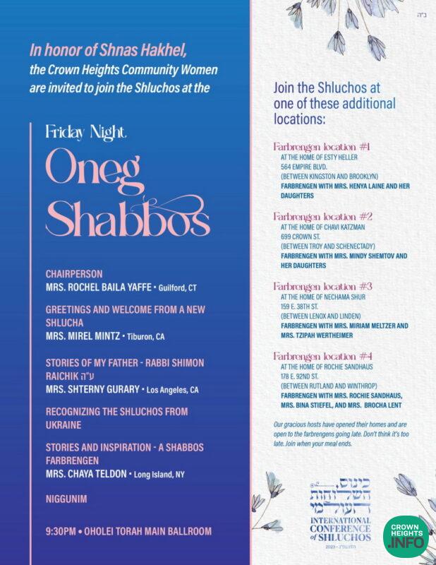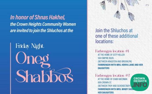 In the spirit of the Hakhel year, the Kinus Hashluchos is inviting all women of the Crown Heights community to join the Friday night Oneg Shabbos and Farbrengens taking place in the neighborhood this week.