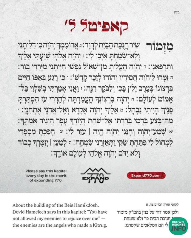 Join me now in promoting and encouraging the expansion, each one in our own capacity and in our own sphere of influence, and by saying Kapitel Lamed of Tehillim every day in merit of the expansion.
