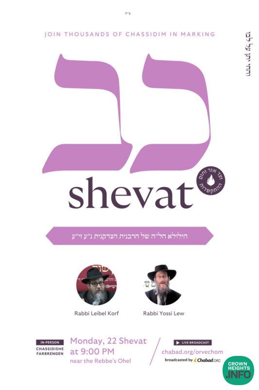 The Farbrengen will take place on Monday, Chof Beis Shevat, at 9:00 PM. Amongst other speakers will be Rabbi Yossi Lew, Atlanta, Georgia, and Rabbi Leibel Korf, Los Angeles, California.