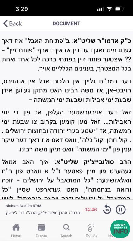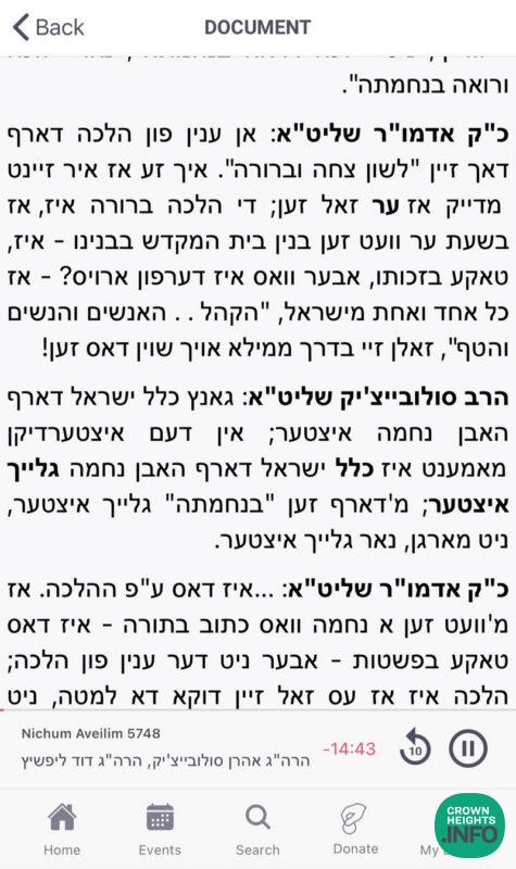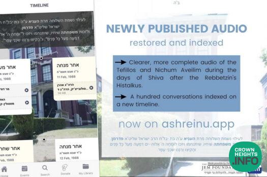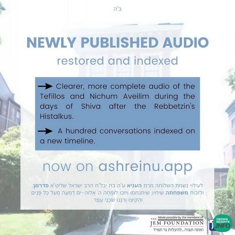 Restored and more complete audio of the Tefillos and Nichum Aveilim during the week of Shiva after the Rebbetzin’s Histalkus has been restored and published, ahead of the Rebbetzin’s 35th Yahrtzeit. An audio timeline indexes over one hundred conversations with noteworthy individuals found amongst many hours of audio. Many of the conversations include transcripts, with more being added in the coming days.