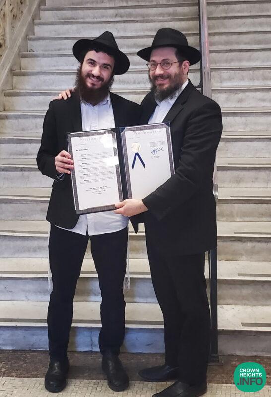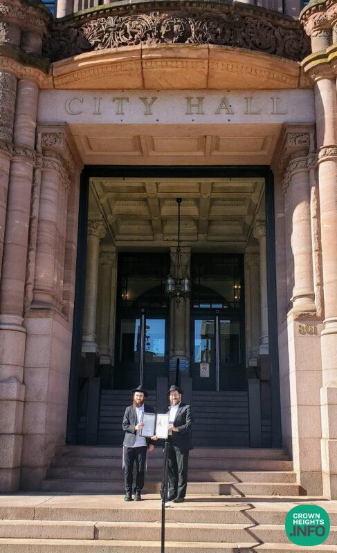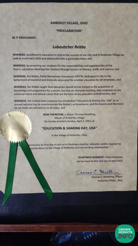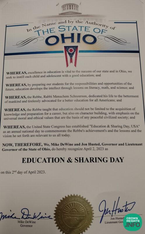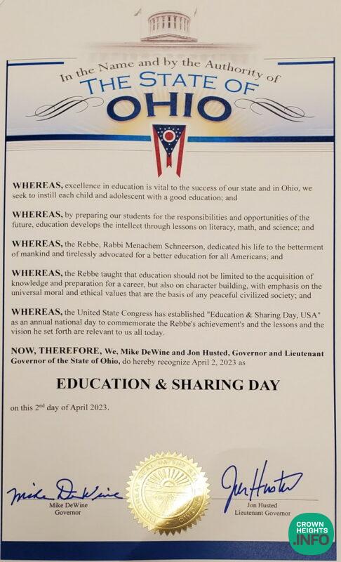Rabbi Gershon Avtzon, Rosh Yeshiva of Yeshivas Lubavitch Cincinnati, made special trips to Columbus (state capital), where he met with the Lt. Governor and to City Hall of Cincinnati and received the proclamations from the Governor and Mayor.