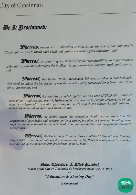 Cincinnati Names Yud Aleph Nissan Education Day In The City