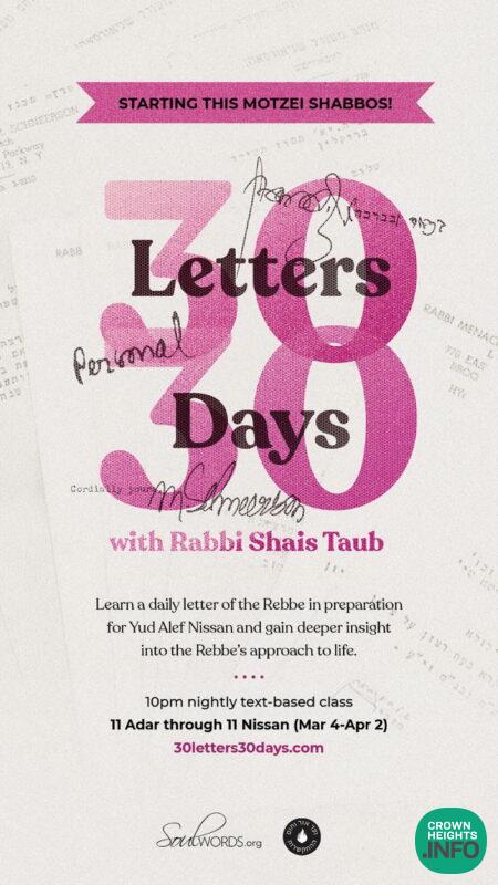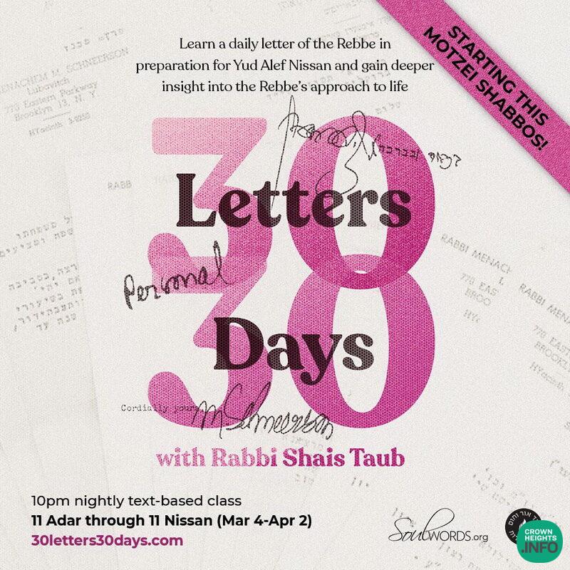Following last year’s successful ‘30 Letters – 30 Days’ program, launched in connection with the Rebbe’s 120th birthday, Vaad Or Vechom Hahiskashrus and Soul Words is pleased to announce that the program will once again be offered to Chassidim around the world in the thirty days leading up to the Rebbe’s birthday on Yud-Alef Nissan!