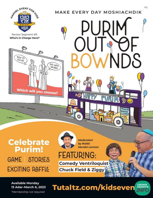 Out of BOWnds, a Kids Purim Hakhel event created by the Moshiach Office at Merkos 302, is available for viewing. A Purim Celebration and wrap-up of the Tut Altz Kids Curriculum- Learn With Geulah Now!- Segment #9- Who’s In Charge Here, the event aims to teach kids how to experience Purim in a Moshiach-like way. When faced with a challenge, we have a choice of following Haman—do things exactly according to the rules of society or to act in a way of Mordechai—letting Hashem dictate the norms.