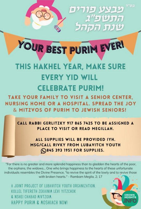 In the spirit of Hakhel, three mosdos and many individuals worked together to make sure each yid was taken care of. For weeks before Purim, the women of Nshei Chabad, led by Mrs. Chana Morozov, have been calling a list of nursing homes and senior centers, to find out exactly what was needed.