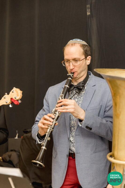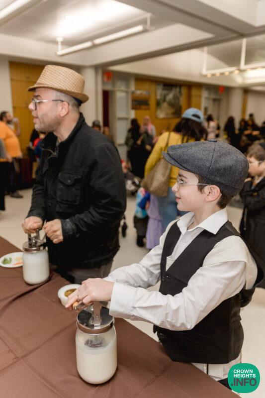 Children had the opportunity to pet baby chicks, enjoyed listening to a klezmer band playing upbeat tunes, made their own pickles, butter, orange juice, and babka! After hearing Megillah, children were handed instruments, and the klezmer band taught everyone how to play a few Purim songs.