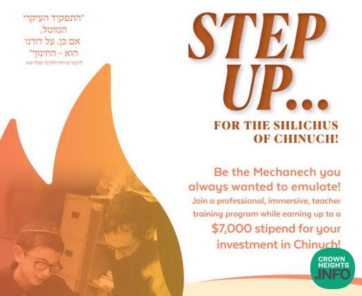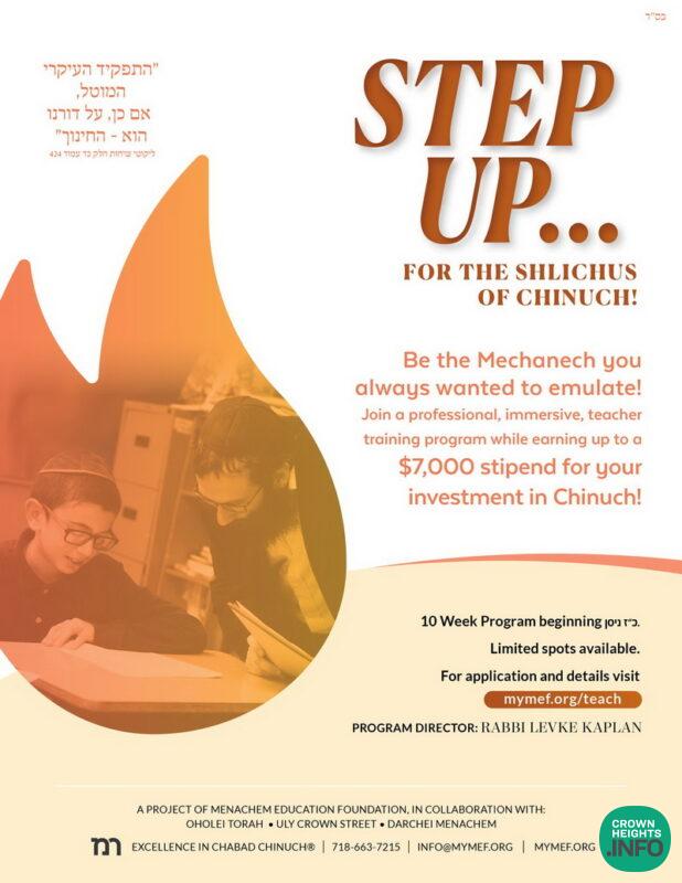 As an organization dedicated to the success of Chabad Chinuch, the Menachem Education Foundation is working to solve the teacher shortage crisis by opening a 10 week course called “Step Up for the Shlichus of Chinuch,” for Chabad Kollel Yungeleit to receive professional teacher training in Crown Heights.