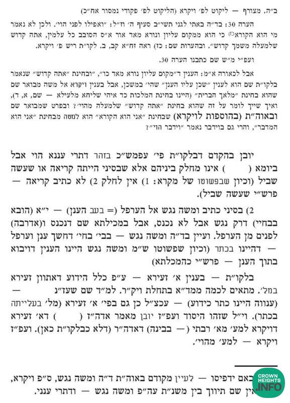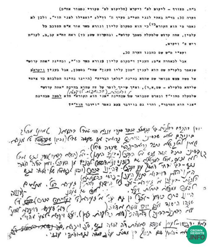 A ‘likkut’ was prepared for Shabbat Parshas Vayikra 5730 (from the Rebbe’s farbrengen on Shabbat Parshas Vayikra 5725, later published in Likkutei Sichos, Volume 7 Page 20), in which Reb Yoel Kahan, who led the writing, editing, and distribution of the Rebbe’s Sichos since the summer of 5710, wanted to clarify a specific point in the sicha. As usual, he submitted a note with his question to the Rebbe through the Mazkirus.