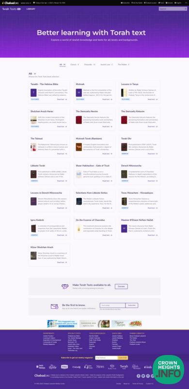 Torah Texts Library: Tanach · Rashi · Onkelus · Ibn Ezra · Ramban · Bal Haturim · Or Hachaim · Rashbam · Seforno · Steinzaltz Tanach Hemuvuar · Mishnayos · Talmud Bavli · Rashi · Tosfos · Mishneh Torah (Rambam) · Shulchan Aruch Harav · Kitzur Shulchan Aruch · Shaar Habitochon · Tanya · Torah Ohr · Likkutei Torah · Derech Mitzvosecha · Kuntres Inyana Shel Toras haChasidus · Likkutei Sichos · Toras Menachem – Hisvaaduyos · Igros Kodesh · and much more in development!