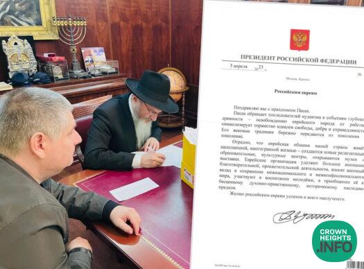 As has become an annual practice leading up to the holiday of Pesach, Russian President Vladimir Putin sent a letter of congratulations directed to the Jews of Russia to Chief Rabbi of Russia, Rabbi Berel Lazar.
