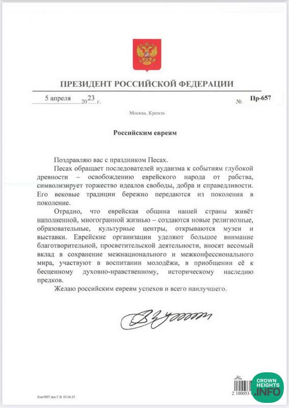 In the letter President Putin writes: “Russian Jews, I congratulate you on Passover.