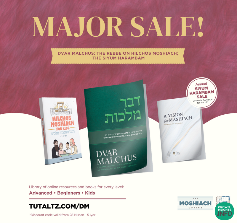 Using the discount code RAMBAM, one can purchase the Dvar Malchus Translated and the Vision for Moshiach and Hilchos Moshiach for Kids at 15% off. The sale will last until Wednesday, 5 Iyar.