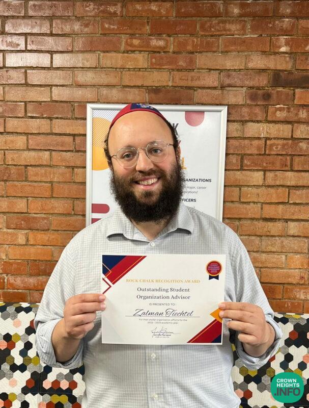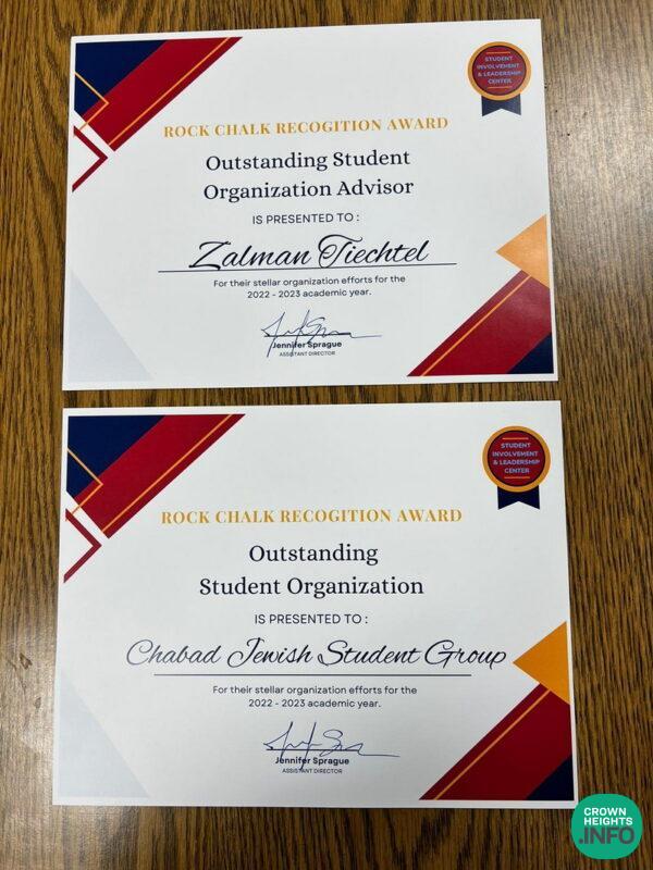 Out of the various awards given out, KU Chabad won two of them. The first award won was recognized as the Student Organization of the Year, acknowledging the positive impact that Chabad has on the entire student body. In addition, Rabbi Zalman Tiechtel was chosen as the KU Advisor of the Year, in recognition of his tireless efforts to support the needs of students and members of the KU community.