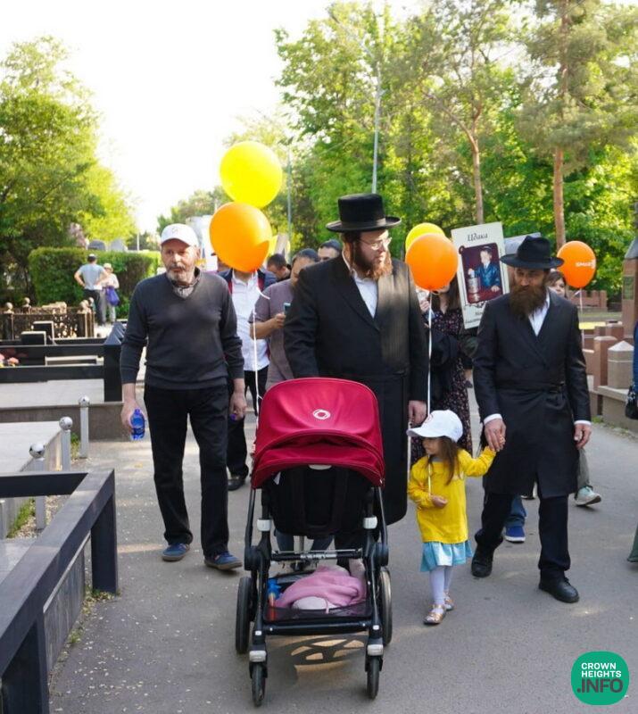 The procession left the Beis Chabad accompanied by music and posters presenting different Mitzvos. The paraders headed towards the holy Tziyun of Rabbi Levi Yitzchak Schneerson, the Lubavitcher Rebbe’s father.