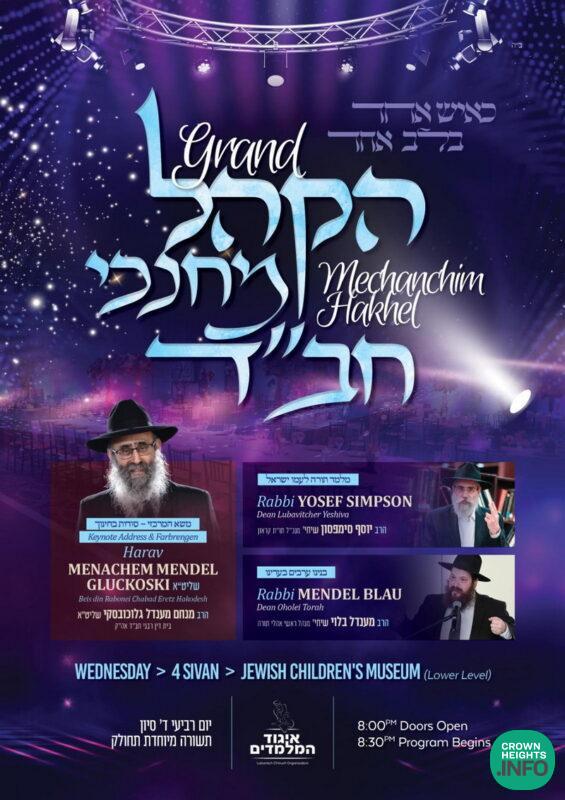 Presenters will include veteran Mechanchem, Rabbi Yosef Simpson, Dean of United Lubavitcher Yeshiva and Rabbi Mendel Blau Dean of Oholei Torah. The keynote address and leader of the Farbrengen will be the highly sought after speaker, a master in all topics, particularly in chinuch, Rabbi Menachem Mendel Glukowski Shlita of Beis Din Rabonei Chabad Eretz Hakodesh.